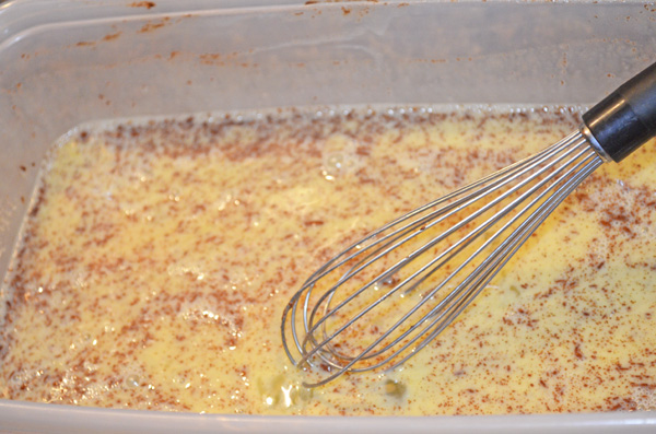 - Whisk eggs, milk, vanilla & cinnamon in square or rectangular dish.