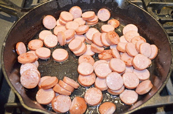 - Heat olive oil in skillet on medium high heat. Add sausage and cook for 5 minutes.