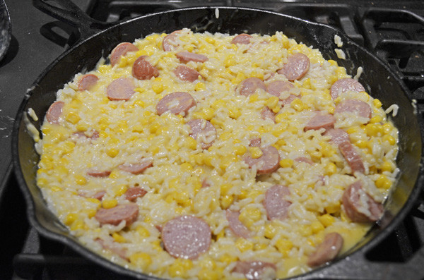 This time I sliced up some turkey sausage links, mixed them with cheddar cheese soup, rice and corn in my skillet. Then I threw (well, not really) the skillet in the oven and baked it for about 20 minutes. This was a huge hit!