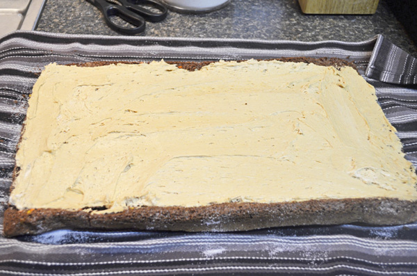 • Unroll cake. Spread your filling to within 1/2″ of the sides/edges.