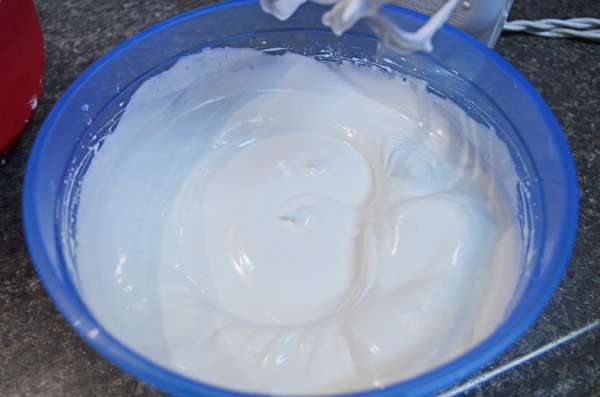 • In a small bowl, beat egg whites on high until foamy. Gradually add in 1/2 cup of the sugar. Beat until still and peaks start to form.