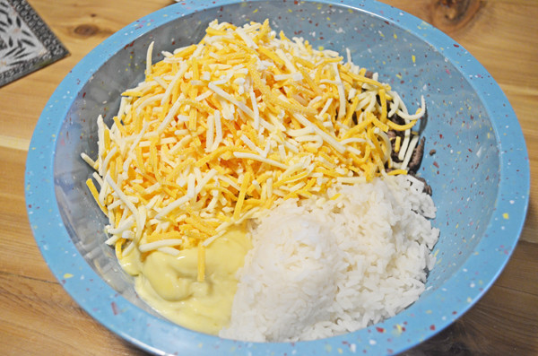 - Mix ground beef, rice, corn, cheese, soup and milk in a medium/large bowl.