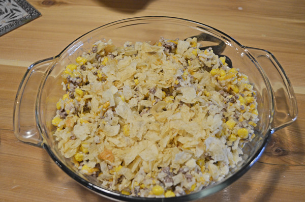 All you need it ground beef, soup, boil in bag rice, shredded cheese, some corn and potato chips. I used Cream of Chicken Soup, but I know most of you reading this will wonder why I didn’t use Cream of Mushroom. I really don’t like mushrooms all that much. But by all means, use Cream of Mushroom if you like that better. Or, Cream of Celery would have tasted pretty good too.