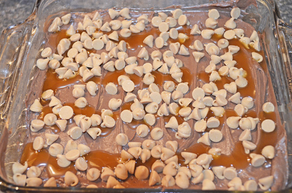 • Drizzle with caramel and add the other 1/2 of your Reeses peanut butter chips.