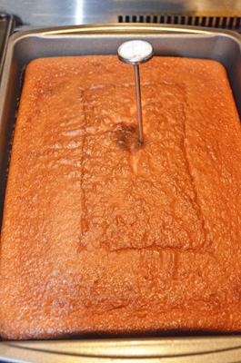 • Take the cake out of the oven when done. Poke holes in the cake. I used the end of a wooden spoon, but you could use toothpicks, skewers, anything to make the holes the size you want and allows the icing to soak through.