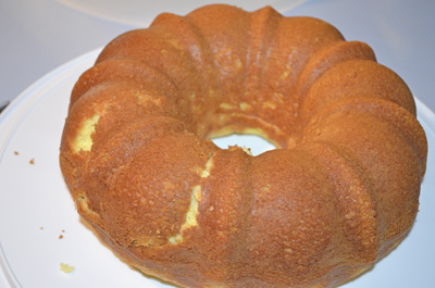 Before we get on with the Lemon Bundt Cake recipe, I figured I would show you how I jacked the cake up when flipping it out of the pan. But as you can see below, it fell out in one piece and I was able to just set it back on and then ice it.