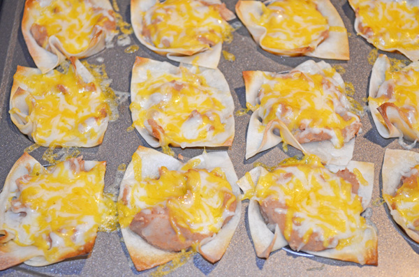 - Add a tablespoon of refried beans to each wonton cup. Place in oven for 5 minutes. **You’ll notice the tips starting to brown.