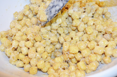 - Pour cereal/marshmallow mixture into 13 x 9 dish. Press down to form.