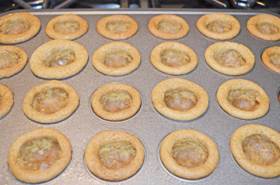 I thought I’d be clever and make the “indention” before baking. May I suggest that you wait about 7 minutes before they’re done and then make the indent. You can use whatever fits. I would still push the dough down in the muffin cup. I used the mini-muffin pan, so I had this drink stirrer that has a ball on the end (you’ll see it in the picture) and was able to just swirl it.