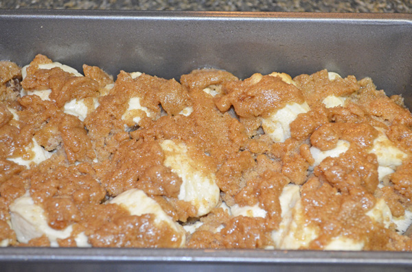 • Cut each biscuit into quarters. Layer the bottom of the loaf pan with half of the quarters.