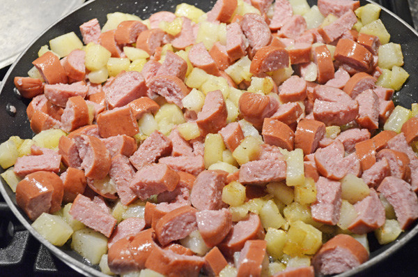 - While the potatoes are cooking, slice and dice the sausage. Add the sausage to the potatoes while they’re still cooking. Cook an additional 5-7 minutes, uncovered. Serve!
