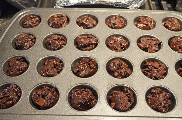 • Spray mini muffin tin with cooking spray. Spoon a heaping tablespoon of brownie batter into each cup. **If you have remaining batter, split it up between the cups.
