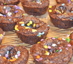 You could spruce them up some with some decor of your choice.  I chose spring colors for my decor.  But you know what would be even better?  Add some frosting in the middle of the brownie bite, then sprinkle the decor on top.  You might have to carry them differently if traveling with them.