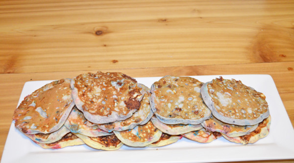Nuff said. Check these White Chocolate and M&M Pancakes out. I made them for two of my daughters, granddaughter and myself. I had some leftover too. And do you know what leftover pancakes are good for? They’re good to just grab and munch on throughout the day. These were so sweet they really didn’t need any syrup.